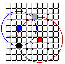 Kommentar zum Spielverlauf: Beim 1. Klick in die rote Zelle wird z.B. der Abstand 4 angezeigt. Dann liegt der verborgene Schatz auf der roten Kreislinie (Radius 4 Einheiten). Beim 2. Klick in die blaue Zelle ist der Abstand 3. Dann kommt für den Schatz die schwarze oder die graue Zelle in Frage. Es sollte also möglich sein, den Schatz in höchstens 4 Spielzügen zu finden. ![]() |