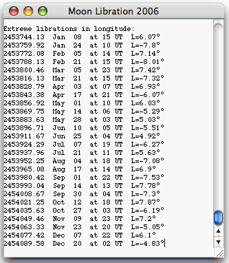 ![]() The 0ptical libration of the Moon from 2006, Jan 1 to 2009, Jan 1. Select "Lib. Path Year" from the Details menu: ![]() 0ptical libration of the Moon 2006 ![]() 0ptical libration of the Moon 2007 ![]() 0ptical libration of the Moon 2008 ![]() 0ptical libration of the Moon 2009 Select "Data Lib." from the Details menu: ![]() Scroll down to see extreme librations in longitude. The