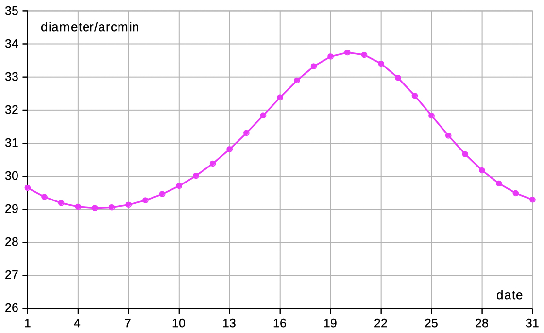 | Select 'distance declin' to see data and diagrams of geocentric distance and declination. | |