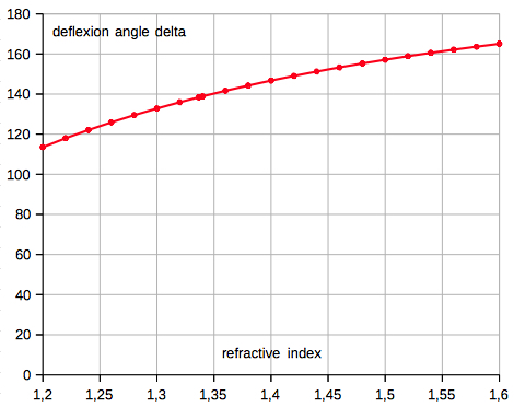 ![]() For k internal reflections the total deflexion δ is: δ = 2(α-β) + k(180°-2β) =