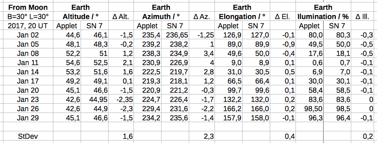 altitude and azimuth of the Earth as seen from different positions on the Moon (latitude B, longitude L) were compared with  Stellarium, using 7 dates (Jul/Aug 2015, at 20 UT). The mean error of the azimuth angle increases for high altitudes: