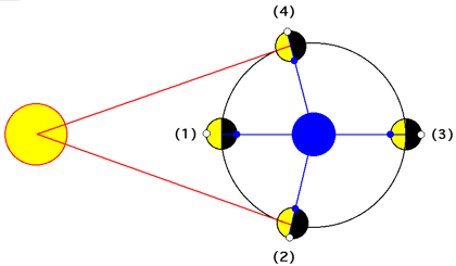 The apparent diameter of the Earth (2°) is approximately four times the Sun's diameter (32').